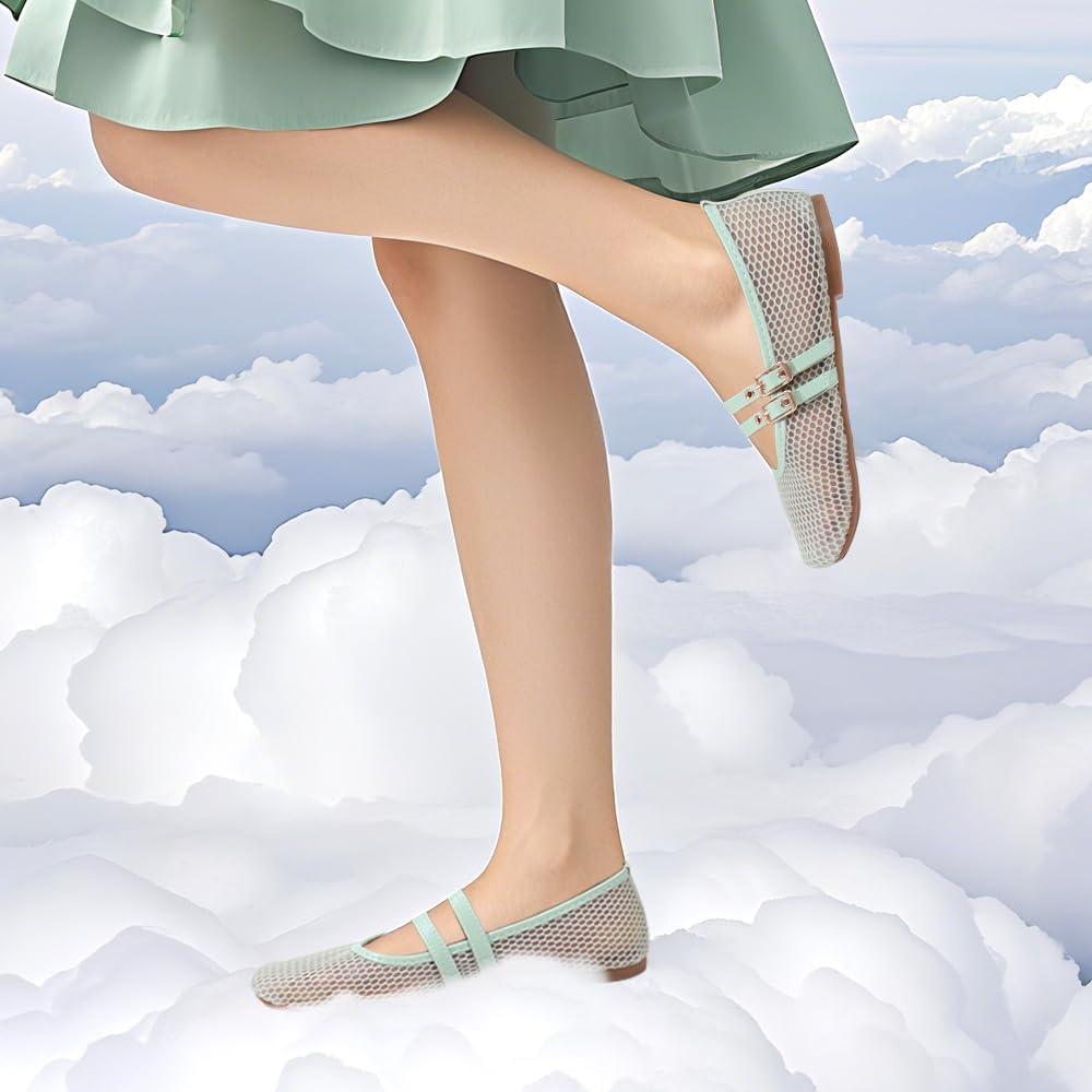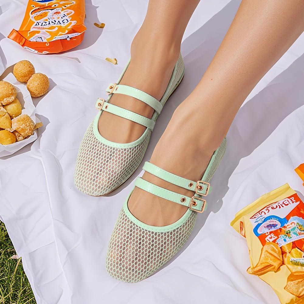 ADAMUMU Women’s Lace Mary Jane Flats – Breathable Mesh Square Toe Ballet Shoes with Buckle Strap for Casual & Dressy Wear(Green)