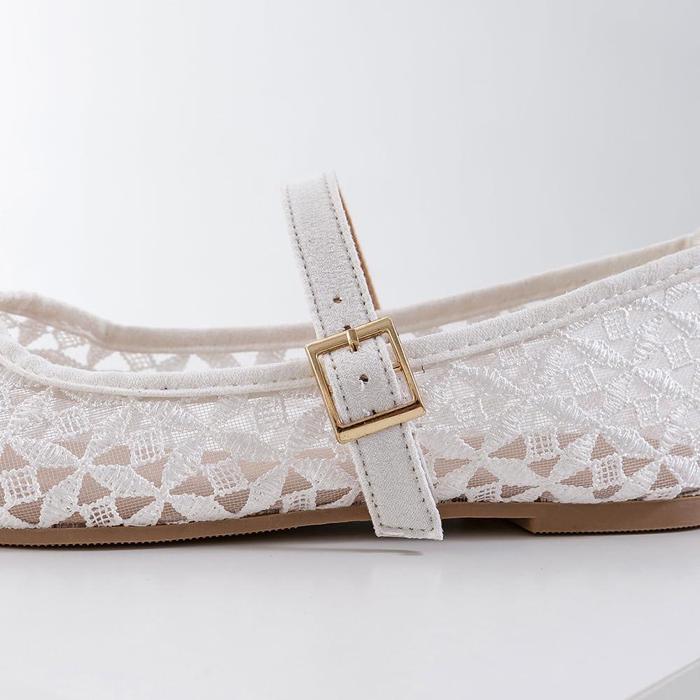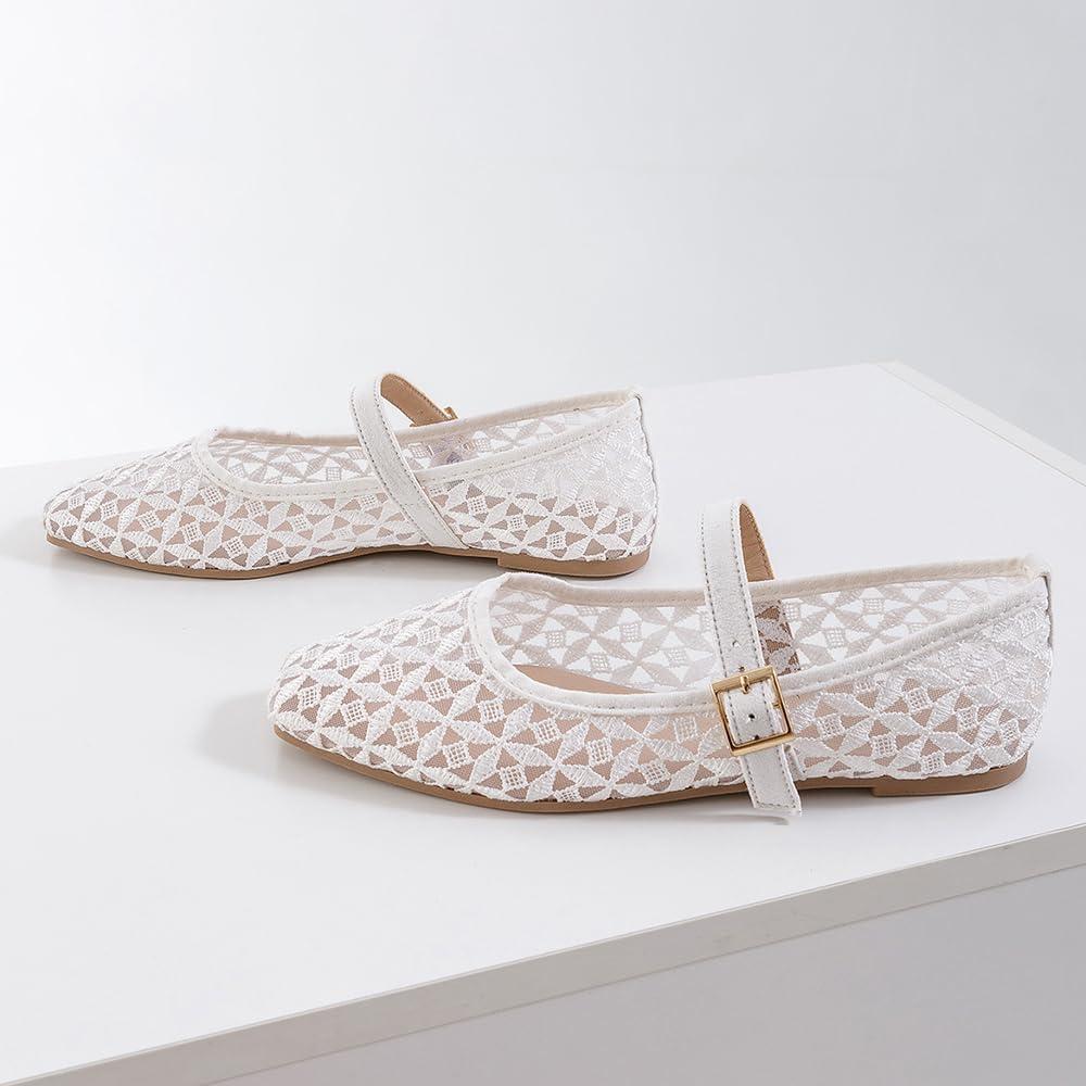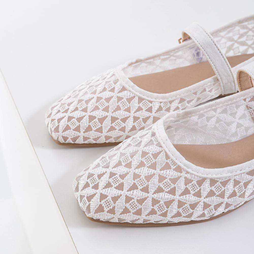 ADAMUMU Women’s Lace Mary Jane Flats – Breathable Mesh Square Toe Ballet Shoes with Buckle Strap for Casual & Dressy Wear(White)